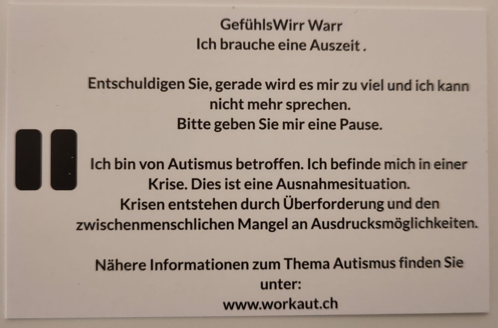Andererseits kann es sein, dass ich meine meine Energie sparen muss für etwas wichtigeres. Mich mit Menschen unterhalten, vor allem solchen die ich nicht kenne, kostet mich viel Energie. Z.B. antworte ich bewusst nicht wenn ich im ÖV angesprochen werde. Ich weiss, dass die Situation für mich schon schwierig genug ist und ich ein Down riskiere, wenn ich nicht möglichst viel Energie spare. In so einem Fall nutze ich die Visitenkarte vom VBM die der Person mitteilt, dass ich Autismus habe und der Vertrauenshund mein Assistenzhund ist. Die Karte ist auch in anderen Situationen nützlich z.B. wenn mir der Zutritt zu Einrichtungen verwehrt wird.
